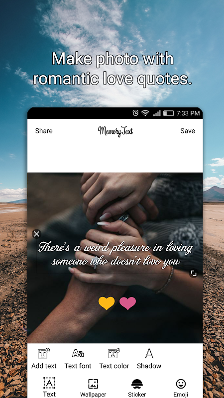 ♥ Memory Text - Text On Photo - Photo Text Editor: help you create love photos with love quotes, love text to send your boyfriend, girlfriend, wife, hushband every day. It is romantic and interesting right?