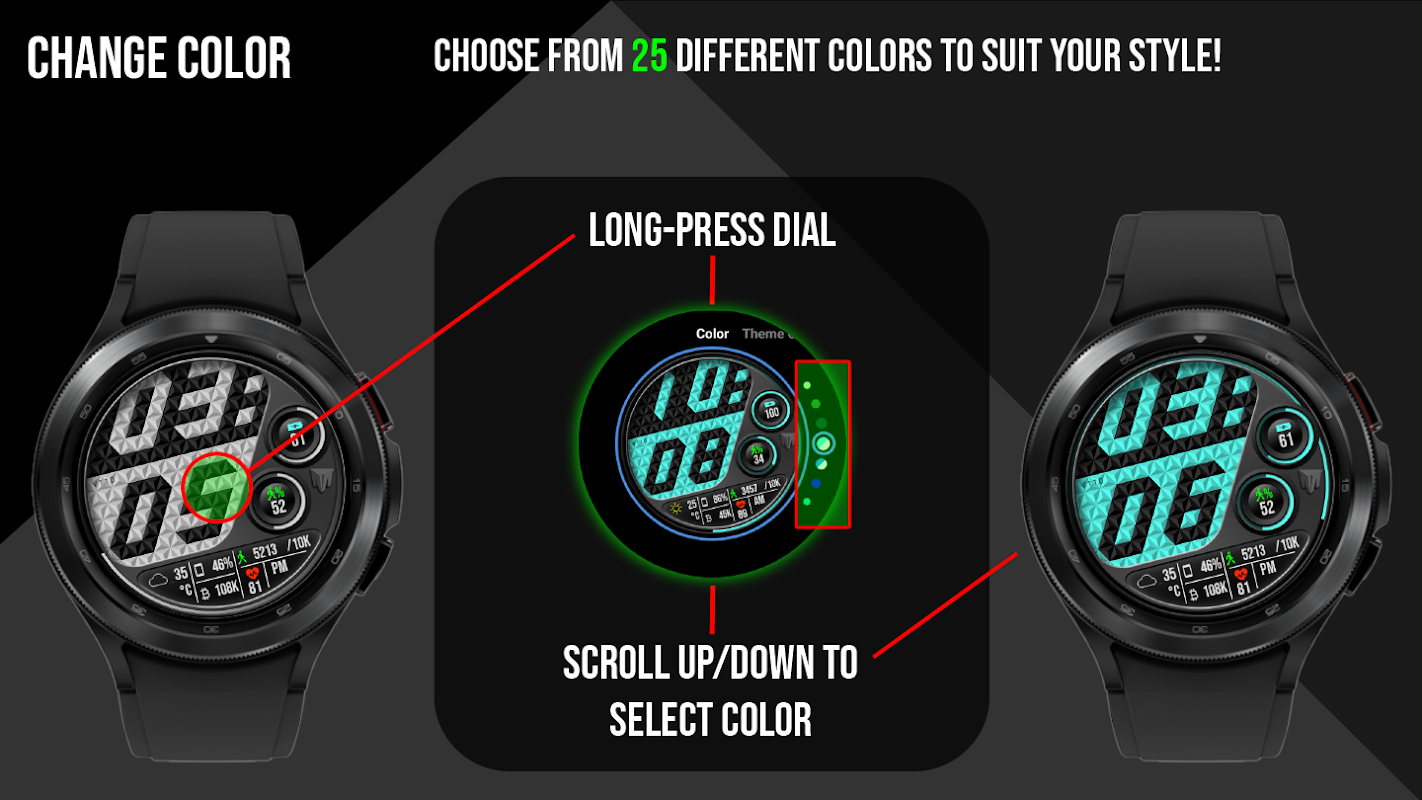 * Météo intégrée : affiche les données météo de l'application météo installée sur votre montre/téléphone. Les données affichées incluent la température, les températures maximales et minimales, des icônes météo personnalisées et un défilement des conditions météo.
