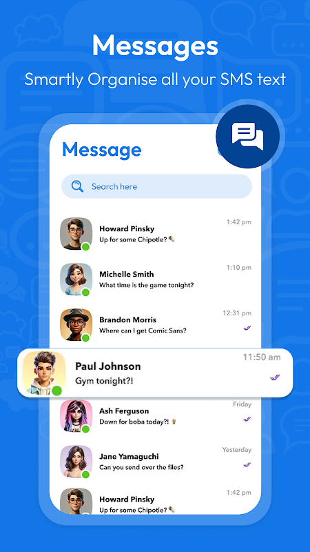 Messages - L'application SMS Texting est conçue pour tout le monde ! Avec une mise en page épurée et sans distraction, il garantit une expérience de messagerie sans tracas. Ouvrez simplement l'application, envoyez des SMS et restez connecté sans effort.