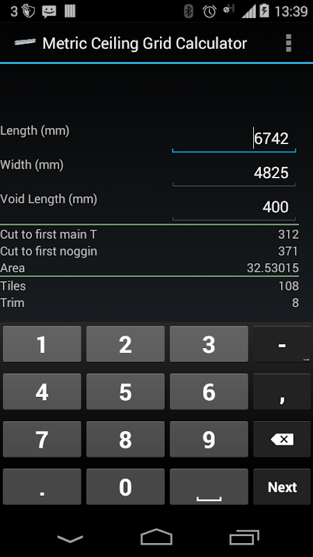 This app calculates The set out dimensions, along with the area , and an approximate list of materials required for installation. This is useful for Ceiling Fixers,Project Managers, Estimators, Small Building Firms.