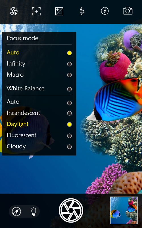 ✔ Open camera functionality: support for focus modes, scene modes, color effects, white balance, ISO, exposure compensation / lock, face recognition, torch.