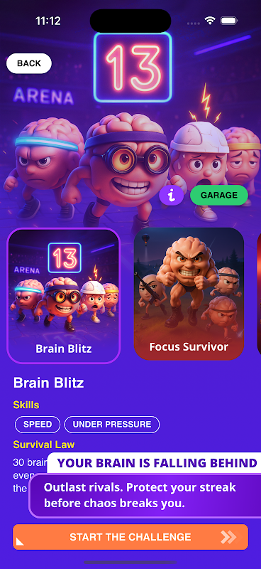 Votre cerveau est votre arme. Affrontez des rounds chaotiques de 13 secondes, des duels entre rivaux et des séries. Tenez assez longtemps pour remporter des titres comme Intouchable, Plus rapide en vie ou Dernier cerveau.
