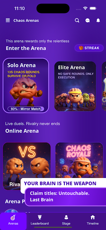 Participez à des duels 1c1, des survies royales ou des combats de clones IA. Éliminez vos rivaux, maintenez vos séries ou cédez sous la pression. Ensuite, rendez-vous sur le fil d'actualité : séries, humiliations et accrochages entre rivaux transforment chaque partie en drame.