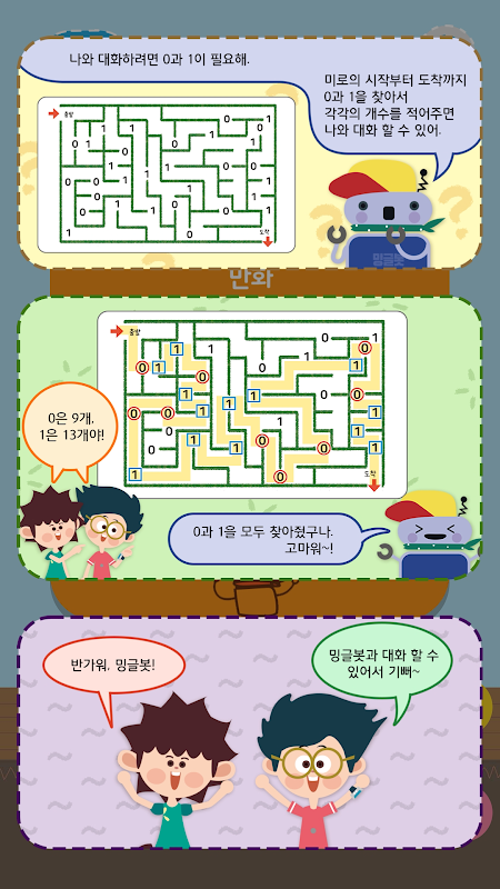 0과 1, 두 개의 수를 찾기 등의 주제들을 기반으로 픽셀을 표현하고 이진법의 원리를 경험할 수 있는 컴퓨팅 사고력을 향상시킬 수 있는 게이미피케이션이다. 컴퓨팅 사고력 개념인 패턴인식, 분해, 추상화, 알고리즘, 디버깅,적용, 응용 원리와 개념을 게임화 한 인터렉티브 앱이다.