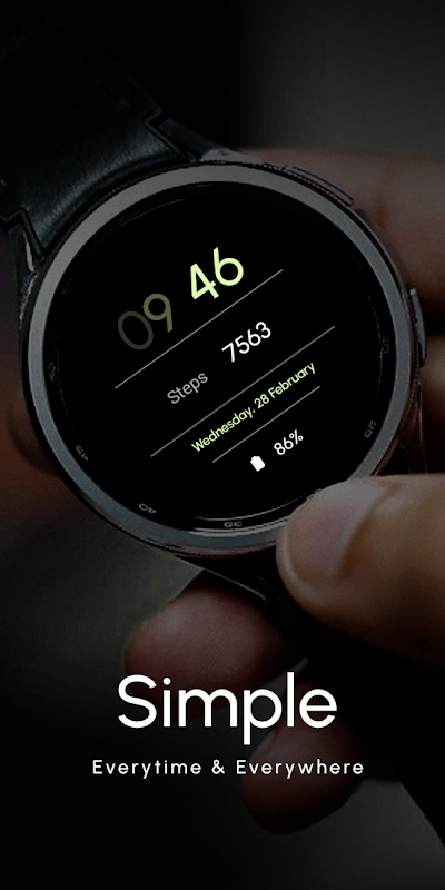 Un design minimaliste de cadran de montre Wear OS, mettant l’accent sur la simplicité et la facilité d’utilisation. Il présente un affichage clair et épuré avec des informations essentielles telles que l'heure et la date, présentées de manière élégante et simple.