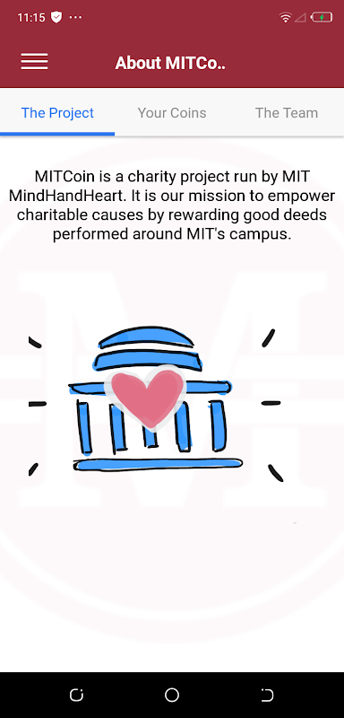 MITcoin is a charity project run by the MindHandHeart group at MIT. It is our mission to empower charitable causes by rewarding good deeds performed around MIT's campus.