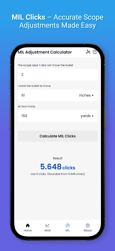 Éliminez les incertitudes liées aux ajustements de portée avec cette calculatrice MOA et MIL facile à utiliser. Que vous composiez votre fusil pour une précision à longue portée ou que vous effectuiez des ajustements rapides sur le terrain, cette application fournit des calculs précis pour les ajustements en minutes d'angle (MOA) et en milliradians (MIL) en fonction de la distance sélectionnée.
