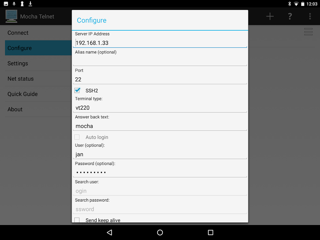 Mocha Telnet / SSH2 permet d'accéder à un serveur Telnet Linux / UNIX. À l'aide de votre téléphone ou tablette Android, vous pouvez vous connecter à un serveur Telnet et exécuter des applications dans une fenêtre de terminal VT220. Exactement comme vous le feriez, si vous étiez assis à votre console système, juste sur un écran plus petit.