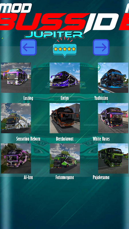 Dans le simulateur de bus illimité mod apk 2023, le mod de bus unique bussid Jaya Jupiter lui-même fournit le simulateur de bus de livrée Indonesia HD mod et également le simulateur de bus Indonesia ac bus mod. Non seulement le mod de livrée bussid jupiter est en plein essor dans le dernier mod bussid de bus touristique 2023, mais d'autres nouveaux mods de bus viraux bussid ont également explosé, tels que le bussid queen maher mod 2023, les kits bussid panda full basuri mod et le mod basuri v3 serpentant les jeunes maîtres.