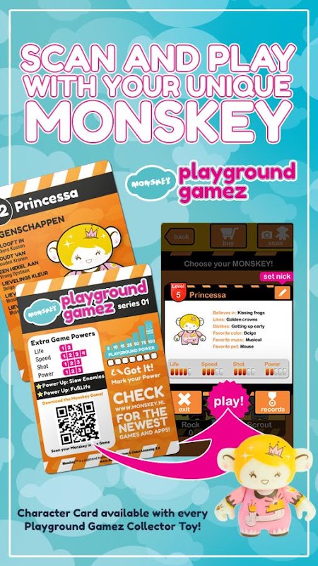 Physical Monskeys are available in flow-packs, to play with additional characters you need to scan the Monskey card available in the flow-pack to give them life in the game. Each figure evolves during the game and obtains their own power ups. There are 24 different figures, the premium ones have unique power-ups.