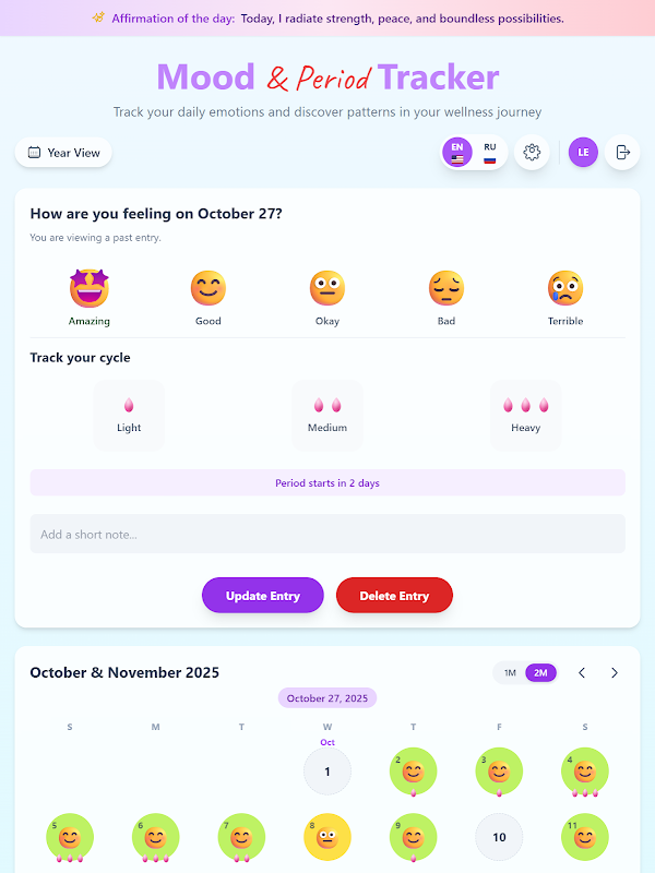 Utilisez-la comme suivi de l'humeur, des règles ou comme journal de bien-être quotidien. Suivez vos émotions, vos symptômes prémenstruels, votre flux menstruel et bien plus encore. Idéale pour toutes celles qui recherchent une application de suivi du cycle, des émotions ou de santé féminine facile à utiliser pour comprendre leurs variations d'humeur et de cycle.