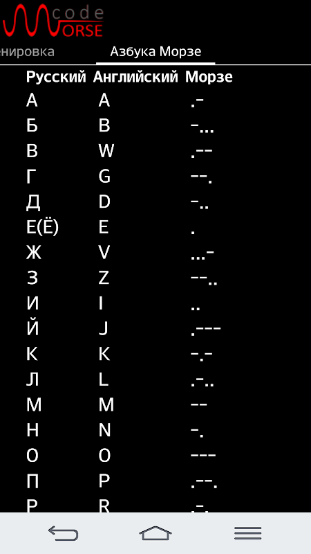 • Тренировка - в этом режиме предлагается поэтапно изучать символы Морзе, каждый раз увеличивая знания и просматривая результаты. С изучением каждого символа в тренировке Морзе открывается новый символ для изучения