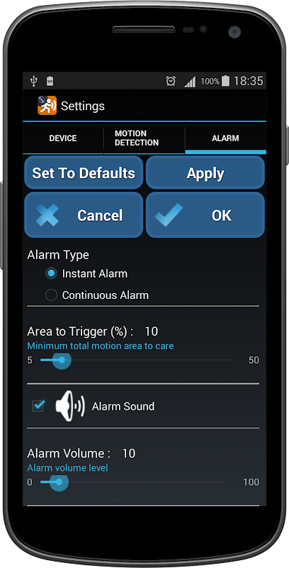* Le principal problème avec les applications de détection de mouvement est l'agitation des dispositifs pendant l'observation. Celles-ci produisent de fausses alarmes. L'application Motion Detector a un algorithme spécialement conçu pour minimiser cet inconvénient.