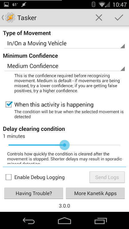 de détection de mouvement est un add-on application pour Tasker ou Locale, qui vous permet de détecter les différents types de mouvements, comme la conduite dans une voiture, un vélo, ou à pied - ou quand ne pas faire une quelconque de ces choses. Vous pouvez vous assurer que vos paramètres "de travail" ne sont pas déclenchées jusqu'à ce que vous avez cessé de conduire, ou activer Bluetooth et désactiver le Wi-Fi alors que vous roulez dans une voiture.