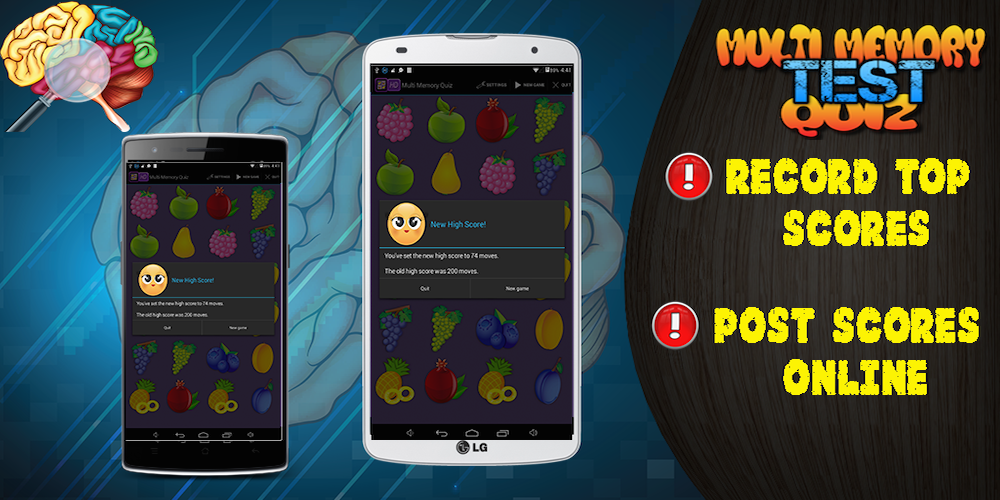 Multi Memory Test Quiz contains different memory matching games with unlimited number of game modes. You can play memory games like fruits memory game, cars memory game, foods memory game, and more.