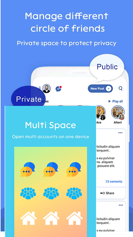 Multiple Space est conçu pour les utilisateurs qui se connectent à plus de 2 comptes (plusieurs comptes) de la même application sur UN TÉLÉPHONE, vous pouvez facilement obtenir deux applications.
