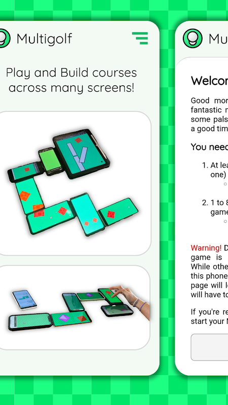 Chaque jeu Multigolf commence par la connexion des téléphones à l'appareil hôte, qui est simplement le premier appareil à démarrer une partie, que les autres peuvent rejoindre. Ensuite, un parcours est construit à l'aide des téléphones dans la vie réelle, en les connectant en traçant des lignes entre eux et en créant ainsi un parcours de minigolf amusant et passionnant qui peut contenir des obstacles et d'autres fonctionnalités amusantes. Ensuite, en fonction du mode de jeu choisi, vous pourrez tirer des balles entre les téléphones dans les trous ! Les téléphones sont connectés sans fil et offrent une interface transparente qui traverse les frontières des téléphones et crée une apparence et une expérience amusantes et satisfaisantes !