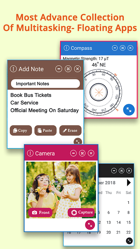 Multitasking With Floating App Windows is collection of floating windows app, using it don't close current app for doing small task like add notes, use calculator, use translator, open camera to click image etc.
