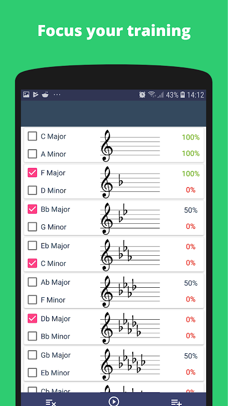 Pour vous aider à vous entraîner, vous pouvez choisir parmi une variété de quiz. Pour chaque test, vous disposez d'un temps limité pour deviner chaque signature de clé. Si vous le souhaitez, vous pouvez vous concentrer uniquement sur les signatures majeures / mineures ou sur les objets tranchants / plats.