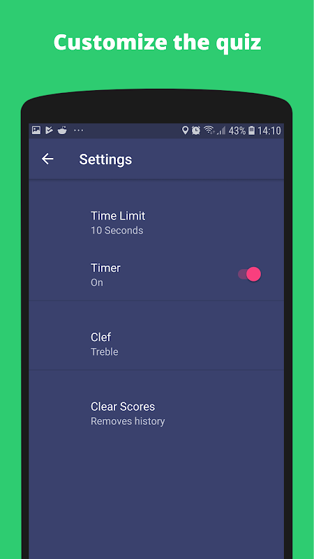 To help train, you can choose from a variety of different quizzes. For each quiz you are given a limited amount of time to guess each key signature. If you wish you can focus on just major/minor signatures or on sharps/flats.