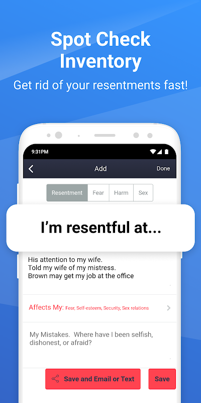 L'inventaire de vérification ponctuelle (pensez à la mini 4ème étape) vous permet de vous débarrasser rapidement des ressentiments lors de vos déplacements et vous pouvez ensuite ajouter plus de détails via votre ordinateur car toutes les données sont cryptées et synchronisées en toute sécurité avec l'application Web !