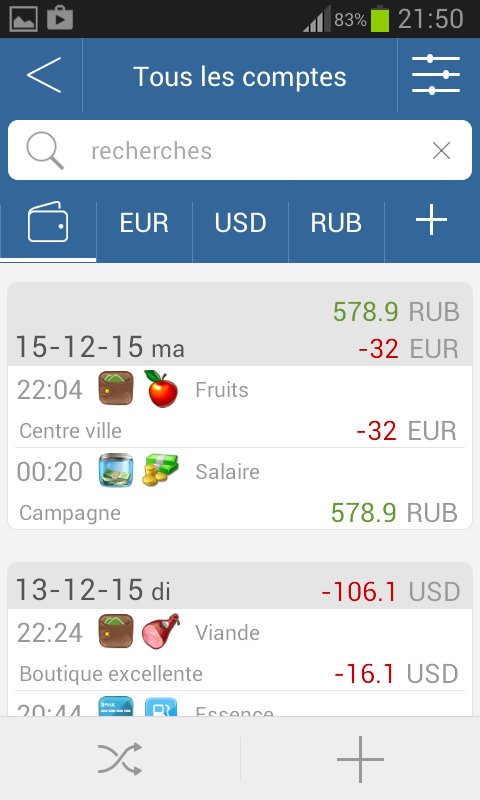 Vos données seront stockées en toute sécurité. L'archivage automatique quotidien vous permettra de ne pas perdre de données, et la synchronisation avec le cloud les sauvera, même si l'appareil tombe en panne. Pour garantir la confidentialité des données, vous pouvez définir un mot de passe d'entrée dans l'application, juste au cas où votre appareil serait utilisé par d’autres personnes. L’utilisation de l’application est très facile à comprendre. Vous serez en mesure d’ajouter de nouveaux comptes très rapidement. Le programme exige un minimum de temps pour la tenue des dossiers, est assez simple en matière de développement pour les novices, tout en offrant des fonctionnalités riches et beaucoup de possibilités pour les utilisateurs expérimentés.