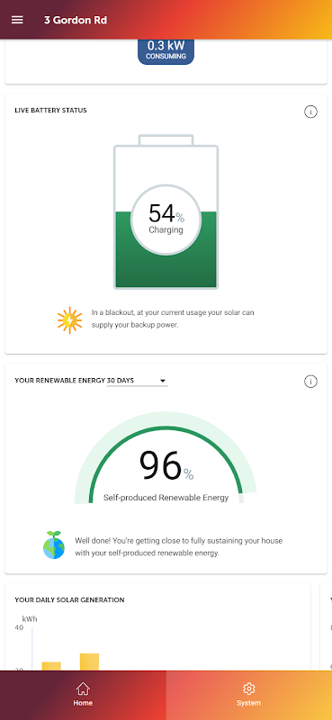 - voir combien d'énergie vos panneaux solaires produisent et les niveaux actuels de stockage dans vos batteries (lorsqu'elles sont connectées)