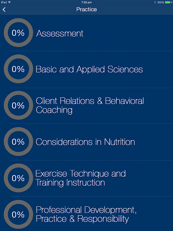 NASM CPT Exam Preparation Practice Test 2020 est une application gratuite développée spécifiquement pour les professionnels du fitness qui se préparent à l'examen de certification NASM Personal Trainer. Avec plus de 200 utilisateurs, l'application NASM CPT Exam Preparation Practice Test 2020 est un guide unique pour votre préparation à l'examen NASM CPT. NASM CPT Exam Preparation Practice Test 2020 vise à aider les utilisateurs dans leur préparation au NASM CPT Test en leur permettant de passer des examens NASM CPT Practice, de répondre à la pratique et de tester leurs connaissances du contenu NASM CPT indépendamment du moment et du lieu.