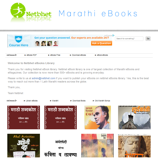 Thank you for visiting Netbhet eBook library. Netbhet eBook library is one of largest collection of Marathi eBooks and eMagazines. Our collection is now more than 500+ eBooks and is growing everyday.