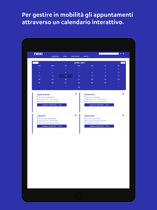 Nexi Tech est la nouvelle application dédiée aux installateurs de points de vente qui travaillent pour le compte de Nexi. L'application vous permet de gérer les processus d'installation, de maintenance et de remplacement du point de vente, de surveiller vos activités et les ressources de votre entrepôt en temps réel