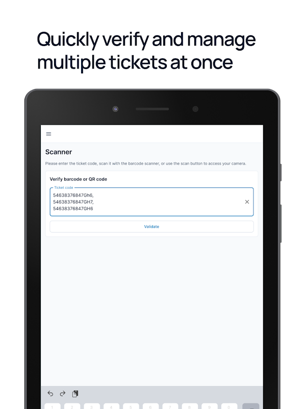 Validez plusieurs tickets manuellement : saisissez manuellement un ou plusieurs codes de ticket lorsque la numérisation n'est pas possible, en vous adaptant aux différents besoins opérationnels.