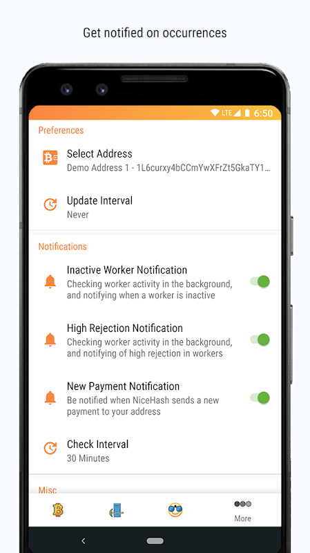 - Recevez une notification lorsqu'un travailleur cesse de travailler ou a un taux de rejet élevé ou lorsque le bitcoin est envoyé à votre adresse depuis NiceHash