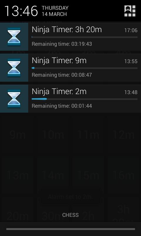Cette application est une minuterie simple qui vous permet de démarrer rapidement un compte à rebours dans votre vie bien remplie. Fatigué de préciser minutes chaque fois que vous voulez faire cuire une pizza? Il suffit de cliquer sur l'un des boutons de présélection et il émet une alarme lorsque le temps est écoulé. Appuyez longuement sur un bouton pour changer sa valeur et cliquez sur la notification d'annuler le compte à rebours. Ninja minuterie comprennent 3 widgets, prend en charge plusieurs comptes à rebours simultanés et vous permet de configurer les préférences suivantes: