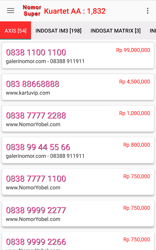 Pasar Nomor Cantik Indonésie, menyediakan Nomor cantik dari opérateur Seluruh.