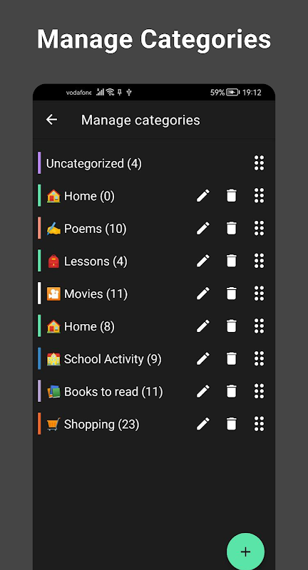 Organisez vos notes par catégorie avec différentes couleurs et noms (par exemple, vous pouvez utiliser l'organisateur de notes pour créer des catégories telles que Notes de travail, Notes d'études, Notes de courses, Notes de tâches ménagères, Notes de voyage, et plus encore !) et accédez à tout.