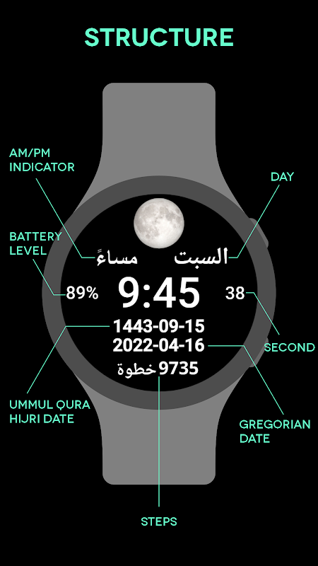 Le cadran numérique arabe est un cadran arabe avec la date Ummul Qura Hijri et la date grégorienne ainsi qu'un compteur de pas. Cette application est conçue pour les montres intelligentes Wear OS.