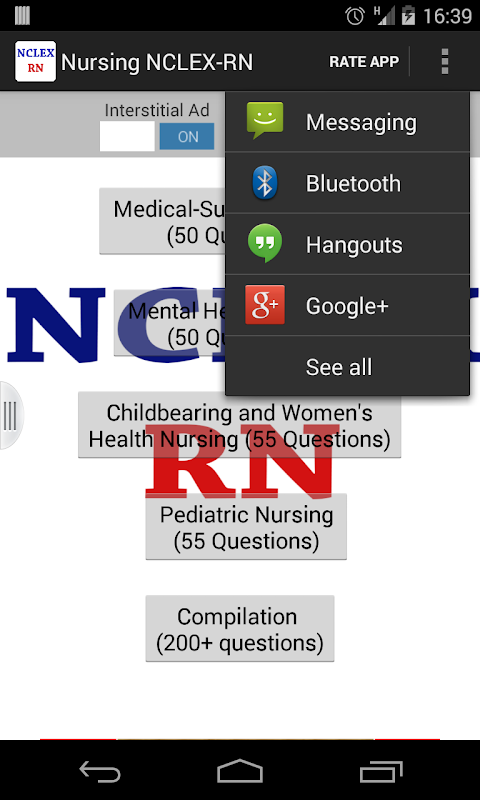 Soins infirmiers NCLEX RN soft est un examen des questions à choix multiples app. Cette pratique est parfaite pour les infirmières qui prennent soins infirmiers NCLEX examen. Cela les aidera examen tout en étant portable. Les questions de soins infirmiers sont classés aux soins infirmiers médico-chirurgical, soins infirmiers en santé mentale, la procréation et la santé sur les soins infirmiers de la femme, les soins infirmiers pédiatriques. Une compilation de toutes les catégories est également inclus, qui se composent de plus de 200 questions libres rn NCLEX.