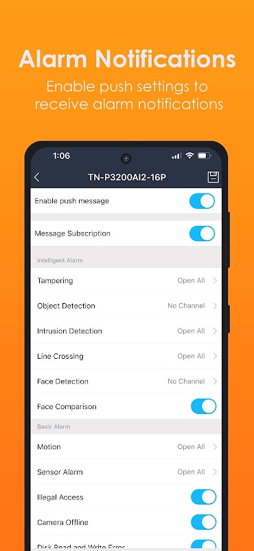 - Notifications d'alarme de base : mouvement, alarme de capteur, caméra hors ligne, erreur de lecture et d'écriture de disque, disque plein, pas de disque, disque de retrait, accès illégal