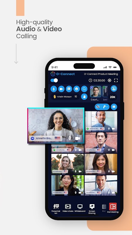 Vous pouvez appeler vos contacts et les engager dans des appels audio ou vidéo, selon vos besoins. O-Connect offre une excellente qualité audio et une qualité vidéo UHD. O-Connect est le meilleur outil pour les webinaires et les conférences Web.