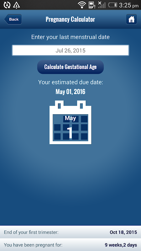 Vous pouvez entrer la date d'échéance estimée de votre bébé et au toucher d'un bouton, vous serez en mesure de calculer les dates de l'échographie de votre bébé (à 7, 12, 19 et 32 semaines de gestation).