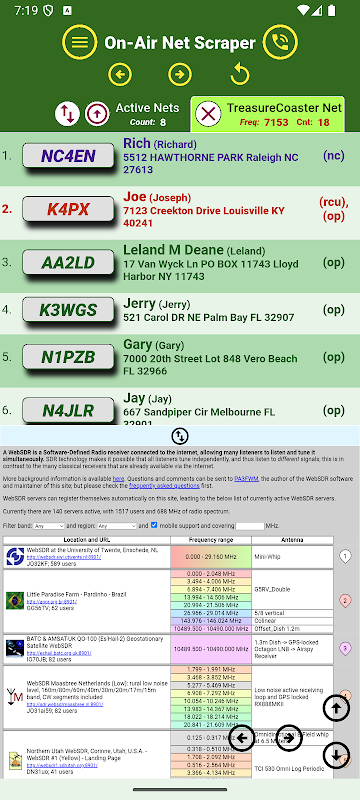 L'application radioamateur On-Air Net Scraper, communément appelée « Net Scraper », a été spécialement développée pour permettre aux radioamateurs d'accéder en temps réel aux services radioamateurs tels que les réseaux en direct, les SMS et l'audio depuis leur smartphone. De plus, On-Air Net Scraper ne se limite pas aux appareils mobiles comme les ordinateurs de bureau. Il est généralement très utile aux opérateurs de portails radio ou aux radioamateurs distants. Ce système complet fournit non seulement la liste des réseaux en direct actifs de NetLogger.org, mais aussi celle d'autres services tels que Ham.Live et les services de Net Scraper. Il peut extraire et rechercher des éléments des anciens réseaux de NetLogger, permettant ainsi aux radioamateurs de retrouver facilement la diffusion d'un indicatif, le réseau auquel ils se sont connectés et la date de leur participation. La messagerie instantanée s'est avérée précieuse pour les radioamateurs afin d'améliorer leurs communications radio lorsque les voies aériennes sont encombrées ou que les signaux sont inadéquats. Par exemple, se connecter à un réseau peut être difficile pendant que les participants transmettent ; l'envoi de SMS peut donc être utilisé pour éviter les interruptions de transmission. De plus, l'application Net Scraper contribue à atténuer les interférences de signal en permettant aux responsables des réseaux radio en direct de recevoir les coordonnées des participants via un smartphone équipé de la solution complète d'envoi et de réception AIM de Net Scraper, ou d'envoyer des SMS en temps réel via les messages NME ou l'interface JS8Call de Net Scraper. Le système de messagerie intégré de Net Scraper propose des messages transparents, tels que des émojis intégrés, pour une expérience plus agréable et expressive lors des transmissions radio en temps réel connectées directement aux réseaux NME et JS8Call. Un radioamateur peut désormais laisser sa radio réglée sur une fréquence JS8Call, partir en voyage et participer à une conversation JS8Call à distance via son smartphone connecté à sa radio via Net Scraper. Grâce à l'accès facile en un clic de Net Scraper, la recherche d'indicatifs d'appel est rapide. Les radioamateurs peuvent surveiller plusieurs enregistrements, sessions SMS, audio ou naviguer sur des portails Internet grâce à un affichage par onglets facilement sélectionnable, et ainsi rester informés en temps réel des réseaux en direct. L'application offre une fonctionnalité intéressante : ses paramètres complets et flexibles permettent aux radioamateurs de mieux la configurer pour une expérience utilisateur plus agréable. Elle permet de consulter les enregistrements NetLogger et/ou les listes AIM, de participer simultanément aux chats AIM NetLogger et de discuter avec les utilisateurs NME ou JS8Call via le mode de transmission JS8 de la radio. Grâce aux écrans partagés Net Scrapers, l'utilisateur peut simultanément surveiller une liste d'enregistrements, participer à une session AIM associée et, via un portail webSDR, écouter une conversation NetLogger On-Air en cours. La nouvelle interface graphique permet d'enregistrer les sessions AIM pour les rejouer localement et à distance. Fonction d'insertion/mise à jour/suppression du carnet de bord QRZ.