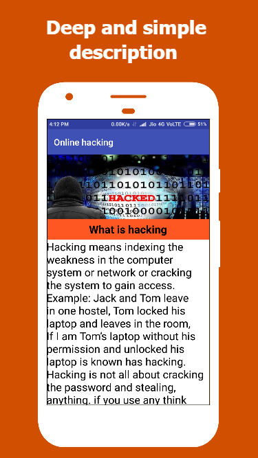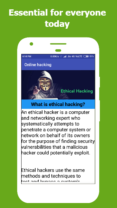 Ova aplikacija pruža dubinsko znanje o hakiranju, nakon korištenja ove aplikacije možete spriječiti hakiranje i znate o sjeckalnim trikovima.