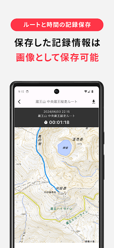 "OnTrails 100 Famous Mountains" ne nécessite aucune création d'itinéraire à l'avance au stade de la planification. Vous pouvez commencer à grimper tout de suite. Vous pouvez profiter de l'alpinisme tout en vérifiant votre position actuelle, même hors ligne, en utilisant la fonction de téléchargement de cartes et d'itinéraires.