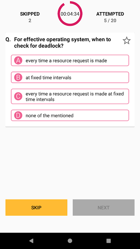 La fonction hors ligne du système d'exploitation mcqs se compose de 17 catégories, contenant plus de 1300 mcq du système d'exploitation hors ligne pour la pratique et l'obtention de commandes sur les points clés des systèmes d'exploitation pour des tests et des examens compétitifs ou d'aptitude tous usages. Tous les mcq du système d'exploitation sont hors ligne et il n'y a pas besoin d'Internet pour pratiquer les mcqs du système d'exploitation.