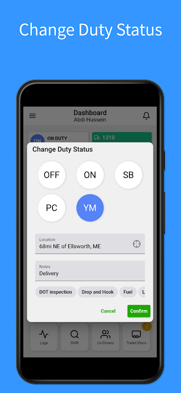 Notre application est conçue pour les conducteurs, en priorisant leurs besoins en créant l'application avec des alertes, une interface facile à utiliser et de grandes icônes. La plupart des fonctions sont accessibles en quelques clics, ce qui garantit simplicité et commodité. Nous comprenons que le mandat ELD peut être complexe, mais nous nous efforçons continuellement de simplifier la conformité FMCSA pour les conducteurs.