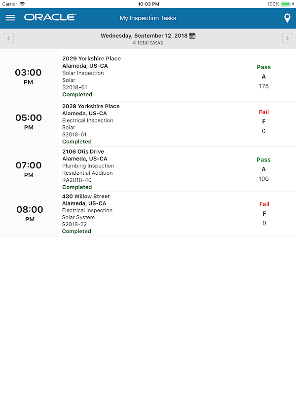 Oracle Inspector offre au personnel gouvernemental sur le terrain la capacité de faire respecter le code à l’aide d’outils de productivité pour effectuer des inspections et générer des rapports sur les inspections n’importe où et à tout moment sur leur appareil mobile.