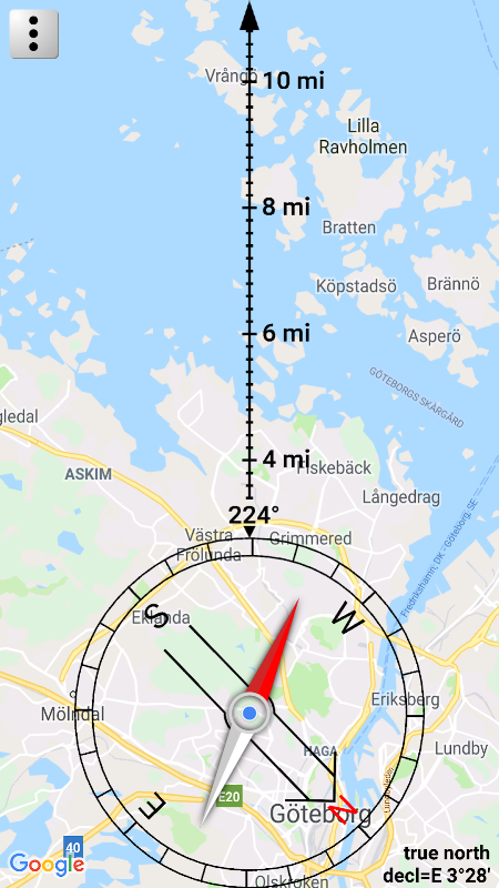 Cette application permet de trouver facilement la direction et la distance par rapport à l'endroit où vous voulez aller. Il dispose d'une boussole qui fonctionne avec une carte et le GPS pour rendre possible la course d'orientation classique. Vous alignez votre position (la position GPS) sur la carte avec votre destination en déplaçant et en faisant pivoter la carte à l'aide d'un ou deux doigts. Tournez le téléphone / tablette jusqu'à ce que l'aiguille de la boussole s'insère dans la flèche d'orientation de la boussole. Ensuite, le téléphone / tablette indique la direction vers la destination.