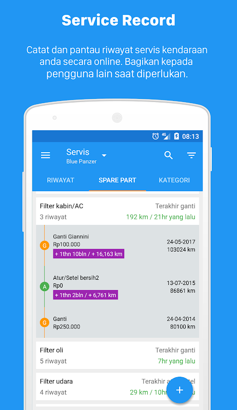 Vous pouvez enregistrer l'histoire du service (enregistrement de service), une histoire de ravitaillement en carburant ainsi que les dépenses liées à votre véhicule telles que l'assurance, taxe sur les véhicules, stationnement, etc.