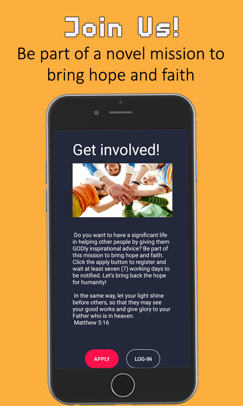 Impliquez-vous - Souhaitez-vous avoir une vie importante en aidant les autres en leur donnant des conseils inspirants de DIEU? Faites partie de cette mission pour apporter espoir et foi. Cliquez sur le bouton Get Involved dans l'application Android pour vous inscrire gratuitement!