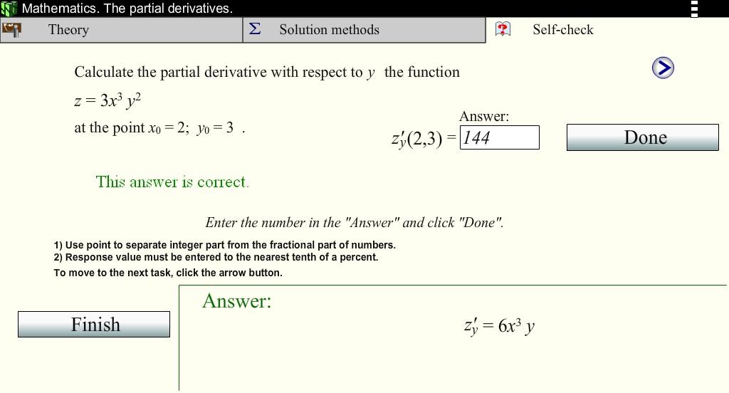 The main purpose of the application is to assist students in mastering key theoretical points and techniques of differentiation, as well as practical skills in getting solutions for the most common tasks on calculation of derivatives and differentials of several variables functions.